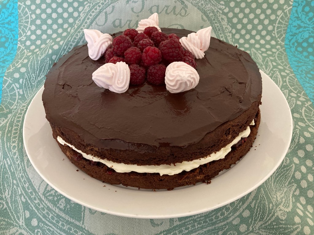 - Once the ganache is cool and thickened, spread over one of the cake halves. On the other half spread raspberry jam, covered with whipped cream. Using a pizza lifter or large cake lifter, lift the cake half with ganache onto the the whipped cream. Top cake with fresh raspberries and meringues.